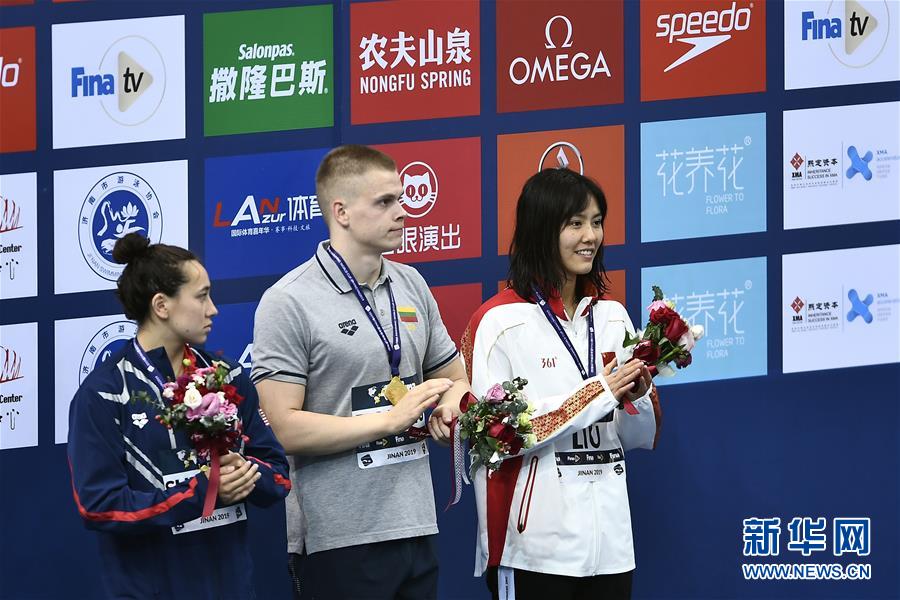 8月8日,刘湘(右)在领奖台上。 当日,在2019年国际泳联游泳世界杯济南站比赛女子50米仰泳决赛中,刘湘以27秒35的成绩获得冠军,并打破世界杯纪录。 新华社记者郭绪雷摄