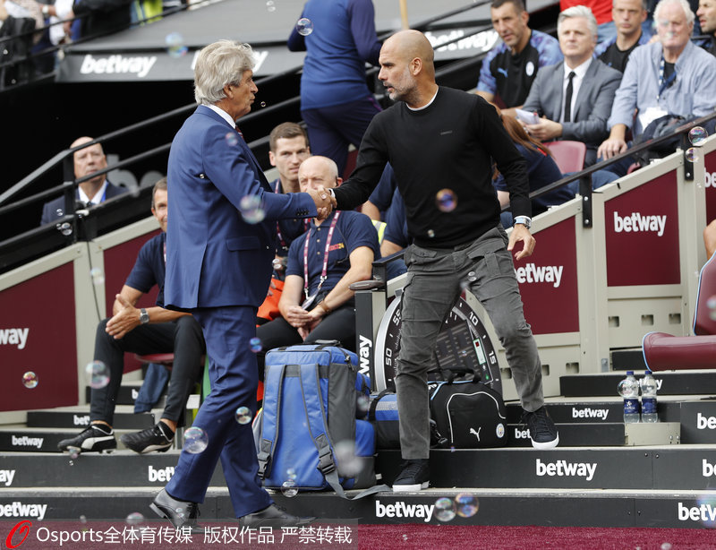 西汉姆联主帅佩莱格里尼(左)与曼城主帅瓜迪奥拉握手