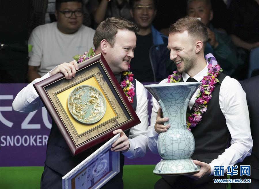 8月11日,贾德·特鲁姆普(右)与肖恩·墨菲在颁奖仪式上。 当日,在2019世界斯诺克国际锦标赛决赛中,英格兰选手贾德·特鲁姆普以10比3战胜同胞肖恩·墨菲,获得冠军。 新华社记者王松摄