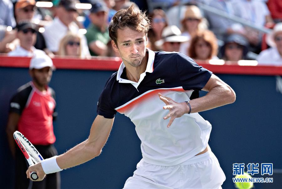 8月11日,梅德韦杰夫在比赛中回球。 当日,在加拿大蒙特利尔举行的2019年罗杰斯杯网球赛男子单打决赛中,西班牙选手纳达尔以2比0战胜俄罗斯选手梅德韦杰夫,夺得冠军。 新华社发(安德鲁·宋摄)