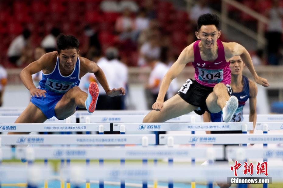 8月14日,山西省太原市,在中国第二届青年运动会田径项目比赛中,北京选手宁潇函(右)以13秒39的成绩夺得体校甲组男子110米栏决赛冠军。中新社记者 韦亮 摄