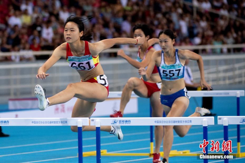 8月14日,山西省太原市,在中国第二届青年运动会田径项目比赛中,山西选手戴仪茹(左)以13秒36的成绩夺得体校甲组女子100米栏决赛冠军。 中新社记者 韦亮 摄