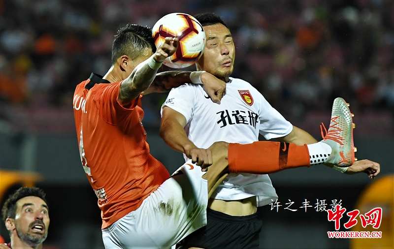 2019年8月14日晚,北京丰台体育中心,中超联赛第22轮比赛,北京人和主场以1比2负于河北华夏幸福。比赛第27分钟,北京人和凭借奥古斯托的进球取得场上领先。5分钟后,马斯切拉诺为河北队赢得点球,拉维奇扳平场上比分。比赛第79分钟,河北队董学升禁区内一脚推射实现反超比分。最终北京人和1比2被河北华夏幸福遭逆转,球队已11轮不胜排名末尾。图为双方的比赛瞬间。工人日报-中工网许之丰摄影报道