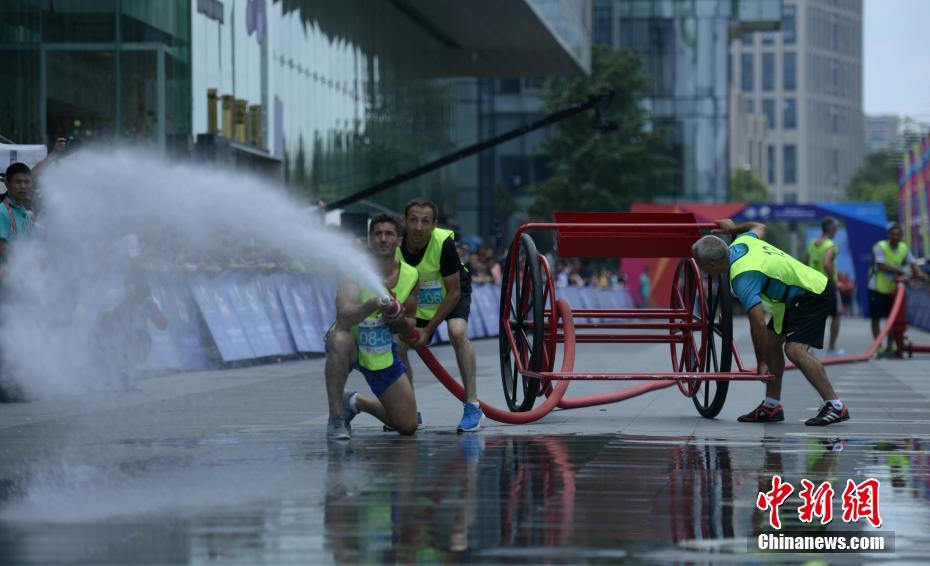8月14日,四川成都,第十八届世界警察和消防员运动会消防专项比赛——召集赛举行。该赛事被称为世警会最好玩、最“水”的项目,吸引了9个国家和地区的118名消防运动员参加,赛事分为水带车和水桶传递两项。图为水带车比赛现场。 中新社记者 刘忠俊 摄