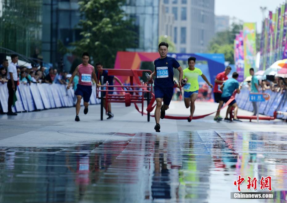 8月14日,四川成都,第十八届世界警察和消防员运动会消防专项比赛——召集赛举行。该赛事被称为世警会最好玩、最“水”的项目,吸引了9个国家和地区的118名消防运动员参加,赛事分为水带车和水桶传递两项。图为水带车比赛现场。中新社记者 刘忠俊 摄