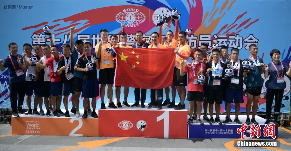 8月14日,四川成都,第十八届世界警察和消防员运动会消防专项比赛——召集赛举行。该赛事被称为世警会最好玩、最“水”的项目,吸引了9个国家和地区的118名消防运动员参加,赛事分为水带车和水桶传递两项。图为颁奖现场,水带车比赛前三名全部被成都消防夺得。 中新社记者 刘忠俊 摄