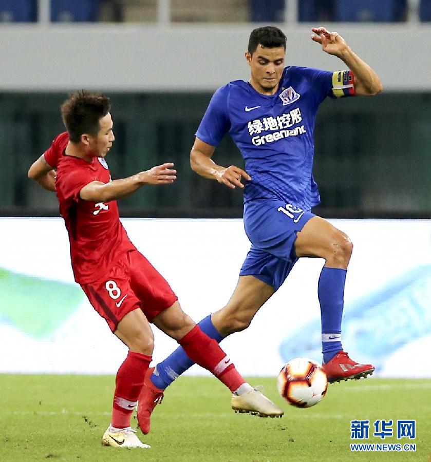 图为上海绿地申花队球员莫雷诺(右)在比赛中带球突破。 新华社发