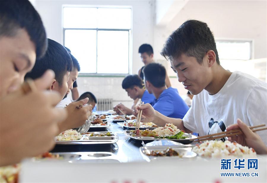 14岁的侯晨熙是西安市体育运动学校拳击队的一名小拳手。今年7月,练习了两年拳击的他在陕西省青少年拳击锦标赛上夺得了自己的第一个省级冠军。然而,冠军的暑假却很短暂,侯晨熙赛后仅休息了两周就重新回到了训练场。 住校练习拳击的侯晨熙平日里上午学习文化课,下午进行体育训练。时值暑假,侯晨熙与队友们不用苦读“万卷书”,但训练却变成了“全日制”。上午练体能、下午练技术,看似单调乏味的假期生活在这名小拳手的眼里却是精彩纷呈。“热爱拳击就要好好训练,我觉得假期这样过挺好的。”由于年龄不满15周岁,侯晨熙无法参加今年举行的第二届全国青年运动会,但是他早为自己定下了目标,“下一届青运会我要站在最高的领奖台上!” 小拳手们在训练馆一遍遍练习移动、出拳、躲闪。拳击手套击打手靶的声音响彻训练馆。这个夏天,还有千万个像侯晨熙一样的小运动员,在训练场上用汗水浇筑着自己的体育梦。 这是侯晨熙(右一)与队友在食堂吃饭(8月15日摄)。 新华社记者张博文摄