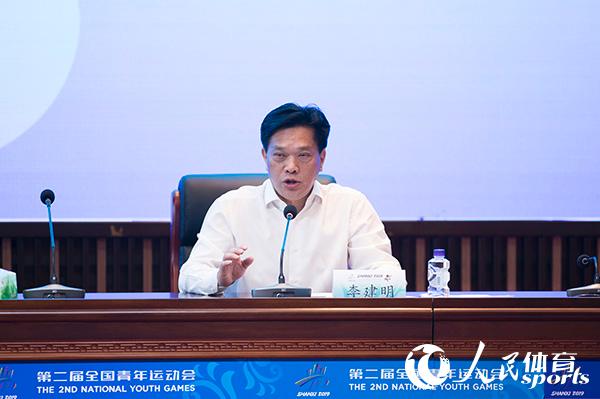 二青会组委会副主任、国家体育总局副局长李建明在发布会上讲话(人民网 张志强摄)