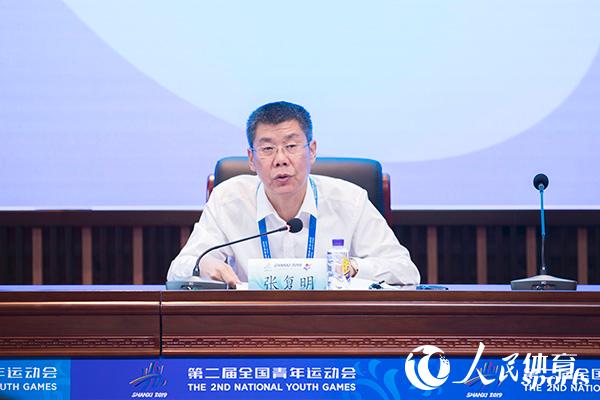 二青会组委会副主任、秘书长、山西省政府副省长张复明在发布会上讲话(人民网 张志强摄)