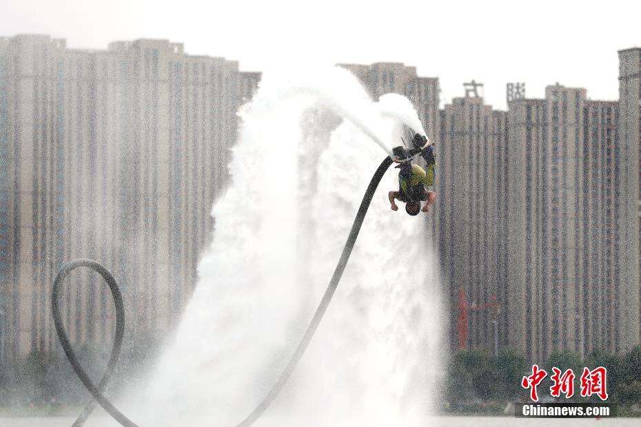 8月20日,运动员进行水上飞人项目的比赛。2019年中国极限运动大会日前在河南濮阳市开幕,自8月18日至24日,全国共计1000多名运动员将进行滑板、轮滑、小轮车、攀岩、冲浪等9个大项的争夺。此次大会担负着中国为2020东京奥运会发现、选拔、培养优秀极限运动员的任务。中新社记者 富田 摄