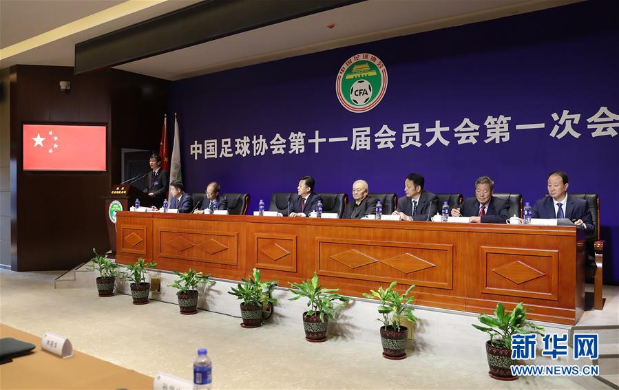 8月22日,中国足协换届筹备工作组组长陈戌源(左一)在大会上作报告。 当日,第十一届中国足球协会会员大会在河北香河国家足球训练基地召开。 新华社记者曹灿摄