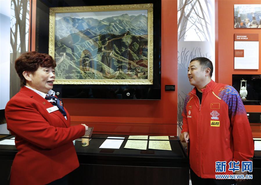 8月22日,讲解员为中国乒协主席刘国梁(右)在尼克松图书馆中国馆内讲解。 当日,正在美国加利福尼亚州洛杉矶一起训练的中美两国国家乒乓球队访问了位于加州约巴林达市的尼克松总统图书馆,并在此举行中美乒协乒乓交流会,共同纪念中美“乒乓外交”48周年。 新华社记者李颖摄