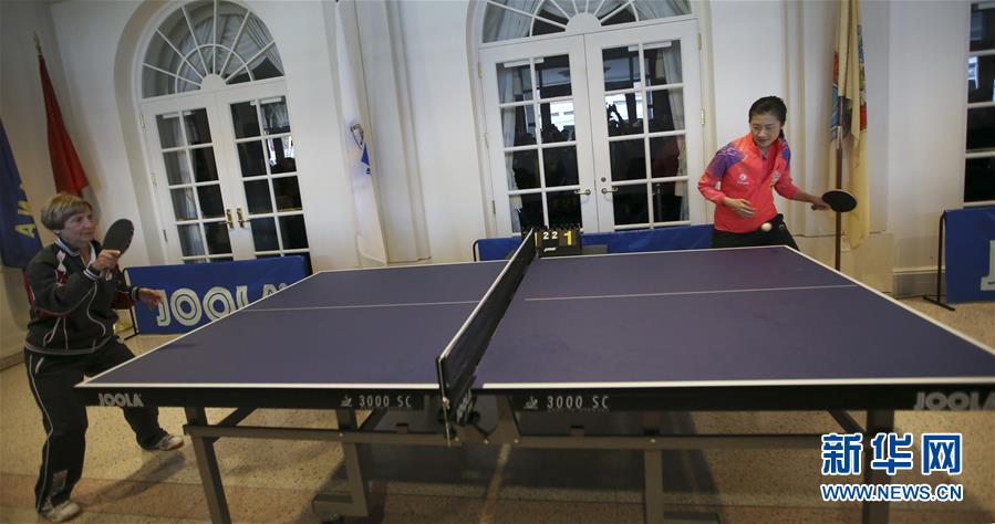 8月22日,中国乒乓球队球员丁宁(右)与一位美国乒乓球爱好者切磋。 当日,正在美国加利福尼亚州洛杉矶一起训练的中美两国国家乒乓球队访问了位于加州约巴林达市的尼克松总统图书馆,并在此举行中美乒协乒乓交流会,共同纪念中美“乒乓外交”48周年。 新华社记者李颖摄