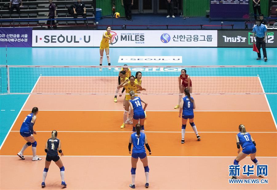 8月22日,中国队球员刁琳宇(上)在比赛中发球。 当日,2019年第20届亚洲女排锦标赛八强战在韩国首尔蚕室综合运动场开赛。在复赛首轮比赛中,中国队以3比0战胜哈萨克斯坦队。 新华社发(李相浩摄)