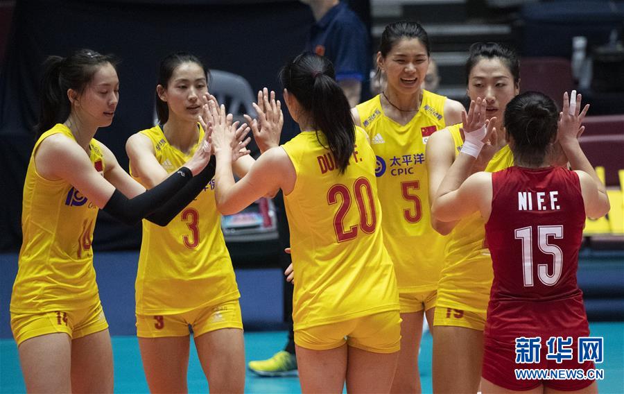 8月22日,中国队球员在比赛中庆祝。 当日,2019年第20届亚洲女排锦标赛八强战在韩国首尔蚕室综合运动场开赛。在复赛首轮比赛中,中国队以3比0战胜哈萨克斯坦队。 新华社发(李相浩摄)