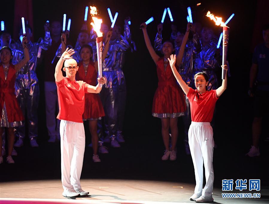 8月25日,火炬手房刚(左)和董金婵(右)在开幕式上传递火炬。 当日,中华人民共和国第十届残疾人运动会暨第七届特殊奥林匹克运动会开幕式在天津体育馆举行。 新华社记者李然摄