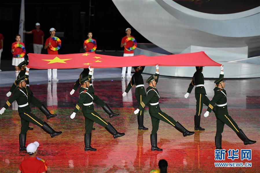 8月25日,旗手护送中华人民共和国国旗进入开幕式现场。 当日,中华人民共和国第十届残疾人运动会暨第七届特殊奥林匹克运动会开幕式在天津体育馆举行。 新华社记者李然摄