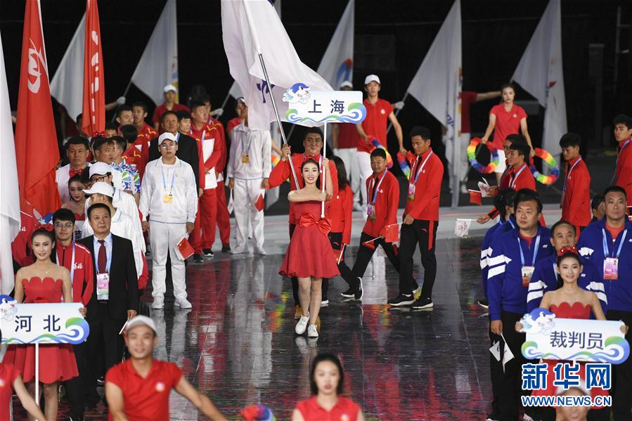 8月25日,上海市代表团在入场仪式上。 当日,中华人民共和国第十届残疾人运动会暨第七届特殊奥林匹克运动会开幕式在天津体育馆举行。 新华社记者李然摄