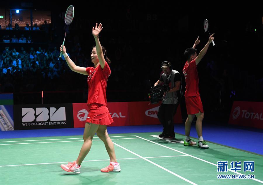8月25日,中国组合郑思维/黄雅琼(左)夺冠后向观众致意。 当日,在瑞士巴塞尔举行的2019年世界羽毛球锦标赛混合双打决赛中,中国组合郑思维/黄雅琼以2比0战胜泰国组合德差蓬/沙西丽,夺得冠军。 新华社记者李俊东摄