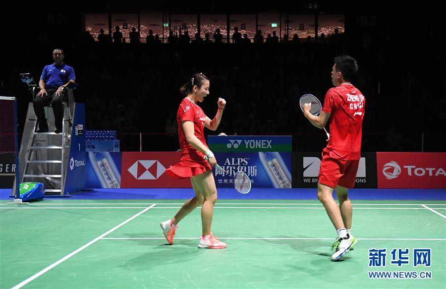 8月25日,中国组合郑思维(右)/黄雅琼庆祝夺冠。 当日,在瑞士巴塞尔举行的2019年世界羽毛球锦标赛混合双打决赛中,中国组合郑思维/黄雅琼以2比0战胜泰国组合德差蓬/沙西丽,夺得冠军。 新华社记者李俊东摄