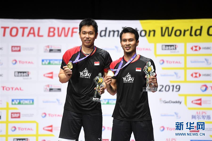 8月25日,印度尼西亚组合阿山(右)/塞蒂亚万在颁奖仪式上。 当日,在瑞士巴塞尔举行的2019年世界羽毛球锦标赛男子双打决赛中,印度尼西亚组合阿山/塞蒂亚万以2比1战胜日本组合保木卓朗/小林优吾,夺得冠军。 新华社记者李俊东摄