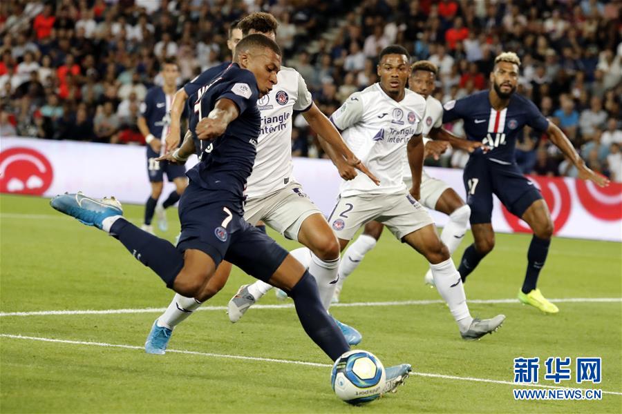 8月25日,巴黎圣日耳曼队球员姆巴佩(左前)在比赛中射门。 当日,在2019-2020赛季法国足球甲级联赛第三轮比赛中,巴黎圣日耳曼队主场以4比0战胜图卢兹队。 新华社发(杰克·陈摄)