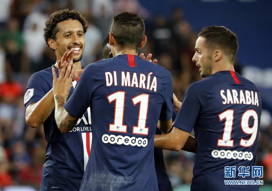 8月25日,巴黎圣日耳曼队球员马基尼奥斯(左一)在进球后和队友迪马利亚(右二)、萨拉维亚(右一)庆祝。 当日,在2019-2020赛季法国足球甲级联赛第三轮比赛中,巴黎圣日耳曼队主场以4比0战胜图卢兹队。 新华社发(杰克·陈摄)