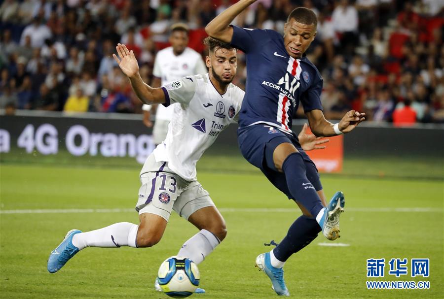 8月25日,巴黎圣日耳曼队球员姆巴佩(右)在比赛中和图卢兹队球员贡萨尔维斯拼抢。 当日,在2019-2020赛季法国足球甲级联赛第三轮比赛中,巴黎圣日耳曼队主场以4比0战胜图卢兹队。 新华社发(杰克·陈摄)