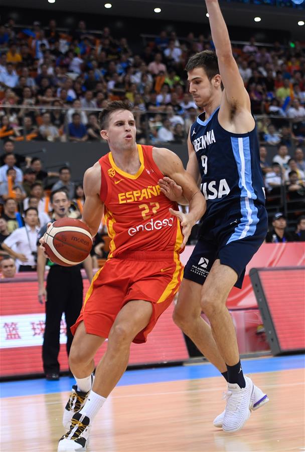 8月27日,西班牙队球员哈维·拉巴塞达(左)在比赛中进攻。 当日,在浙江宁波奥体中心举行的2019国际男篮热身赛中,西班牙队以84比76战胜阿根廷队。 新华社记者黄宗治摄
