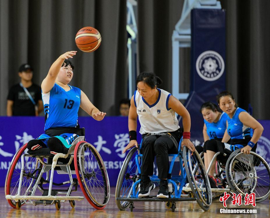 8月28日,天津,四川女子轮椅篮球队队员尚婷(蓝)在第十届残运会女篮比赛中。22岁的羌族女孩尚婷来自四川省汶川县映秀镇,是四川女子轮椅篮球队年龄最小的队员。在2008年汶川大地震中,她被掩埋在废墟中长达100多个小时,是映秀小学最后一名被营救出来的幸存学生。因为埋压时间太久,尚婷失去了双腿、左眼和左手食指。中新社记者 佟郁 摄