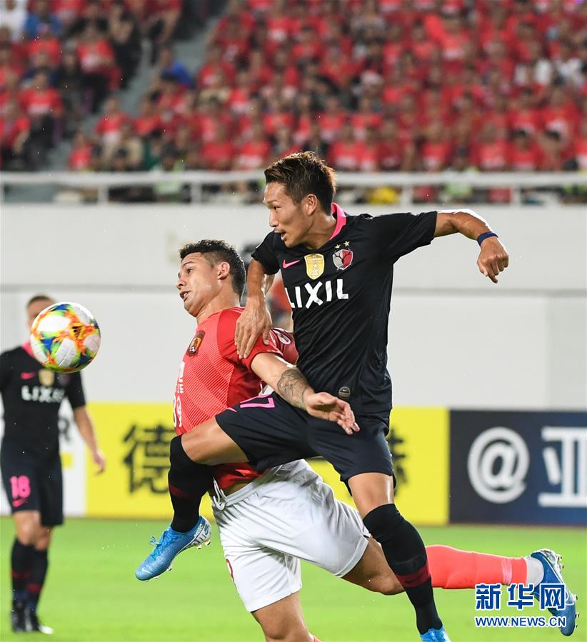 8月28日,广州恒大队球员埃尔克森(左)与鹿岛鹿角队球员小泉庆在比赛中拼抢。 当日,在2019年亚冠联赛四分之一决赛首回合比赛中,中超广州恒大队主场以0比0战平日本鹿岛鹿角队。 新华社记者邓华摄