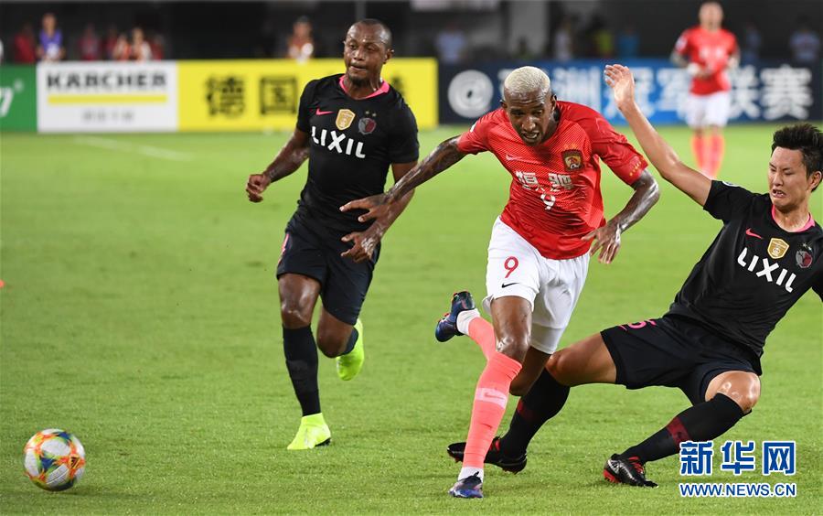 8月28日,广州恒大队球员塔利斯卡(中)在比赛中拼抢。 当日,在2019年亚冠联赛四分之一决赛首回合比赛中,中超广州恒大队主场以0比0战平日本鹿岛鹿角队。 新华社记者邓华摄