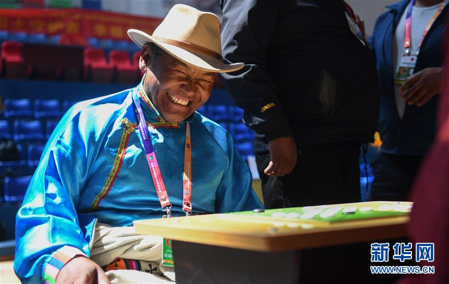 8月29日,白朗县参赛选手顿珠在赢得比赛后庆祝。 当日,在西藏日喀则市首届农牧民运动会上,34名藏棋爱好者同场对弈,一决高下。 藏棋又名“多眼棋”或“多目戏”,是长期流行在青藏高原的一种古老棋类游戏。藏棋历史源远流长,棋种丰富,男女老少皆宜,兼具竞技性与趣味性,是藏民族社会文化生活中的重要内容。 新华社记者晋美多吉摄