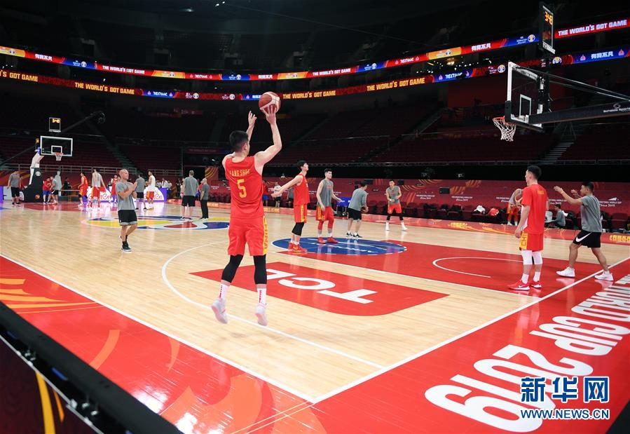 8月30日,中国队球员在五棵松体育馆进行训练。 当日,中国队在五棵松体育馆进行训练并举行赛前新闻发布会。中国队的本届男篮世界杯首战将于8月31日进行。 新华社记者张晨霖摄