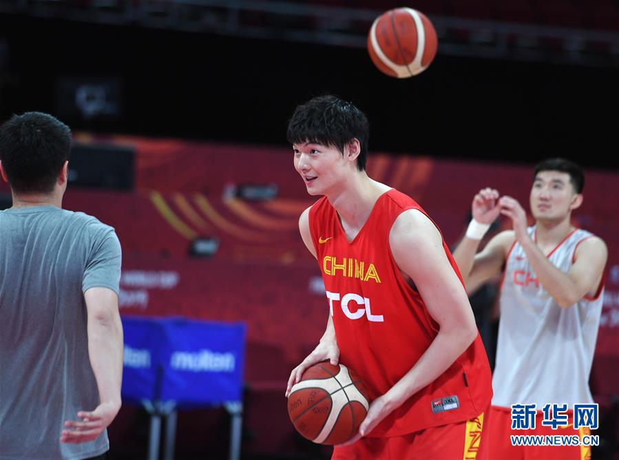 8月30日,中国队球员王哲林(中)在训练中。 当日,中国队在五棵松体育馆进行训练并举行赛前新闻发布会。中国队的本届男篮世界杯首战将于8月31日进行。 新华社记者张晨霖摄