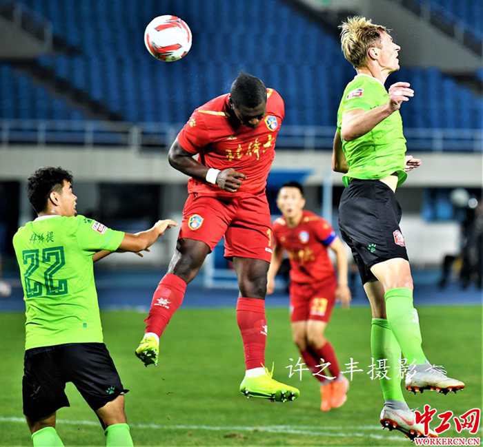 8月31日晚,2019中甲联赛第24轮比赛,在国家奥体中心体育场进行,北京北体大队主场以3比1战胜新疆雪豹队。北京北体大队凭借戈武的梅开二度以及梁学铭的外围远射,最终以3比1战胜新疆雪豹队。北京北体大队执行教练宿茂臻代替高洪波首次担任执行教练。图为双方的比赛瞬间。工人日报-中工网许之丰摄影报道
