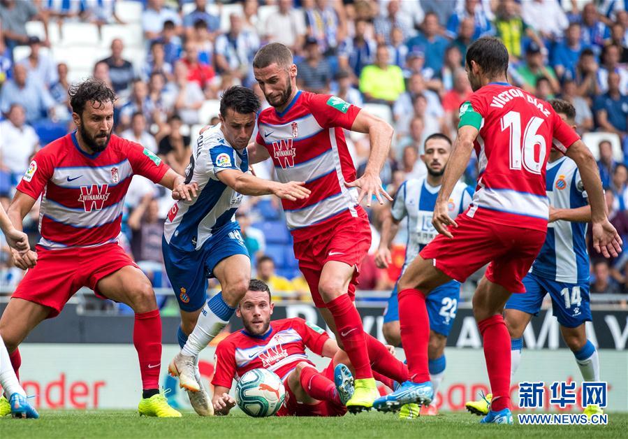 9月1日,西班牙人队球员塞巴斯蒂安·科尔夏(左二)和格拉纳达队球员在比赛中争抢。 当日,在2019-2020赛季西班牙足球甲级联赛第3轮比赛中,西班牙人队主场以0比3不敌格拉纳达队。 新华社发(胡安·戈萨摄)