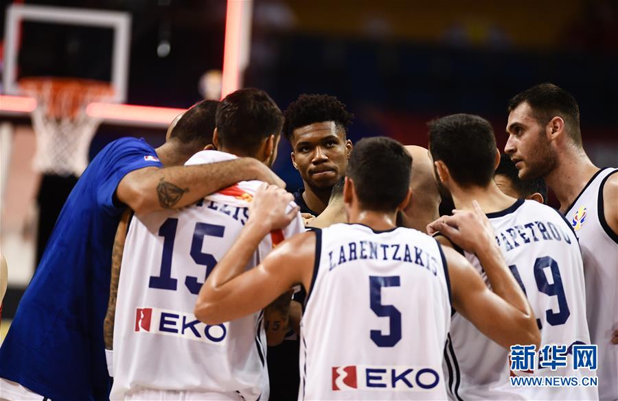 9月1日,希腊队球员扬·安特托昆博(左三)在赛后和队友庆祝胜利。 当日,在南京举行的2019年国际篮联篮球世界杯小组赛F组比赛中,希腊队以85比60战胜黑山队。 新华社记者李响摄