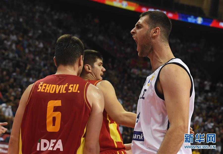 9月1日,希腊队球员帕帕扬尼斯(右)在比赛中庆祝得分。 当日,在南京举行的2019年国际篮联篮球世界杯小组赛F组比赛中,希腊队以85比60战胜黑山队。 新华社记者 韩瑜庆 摄