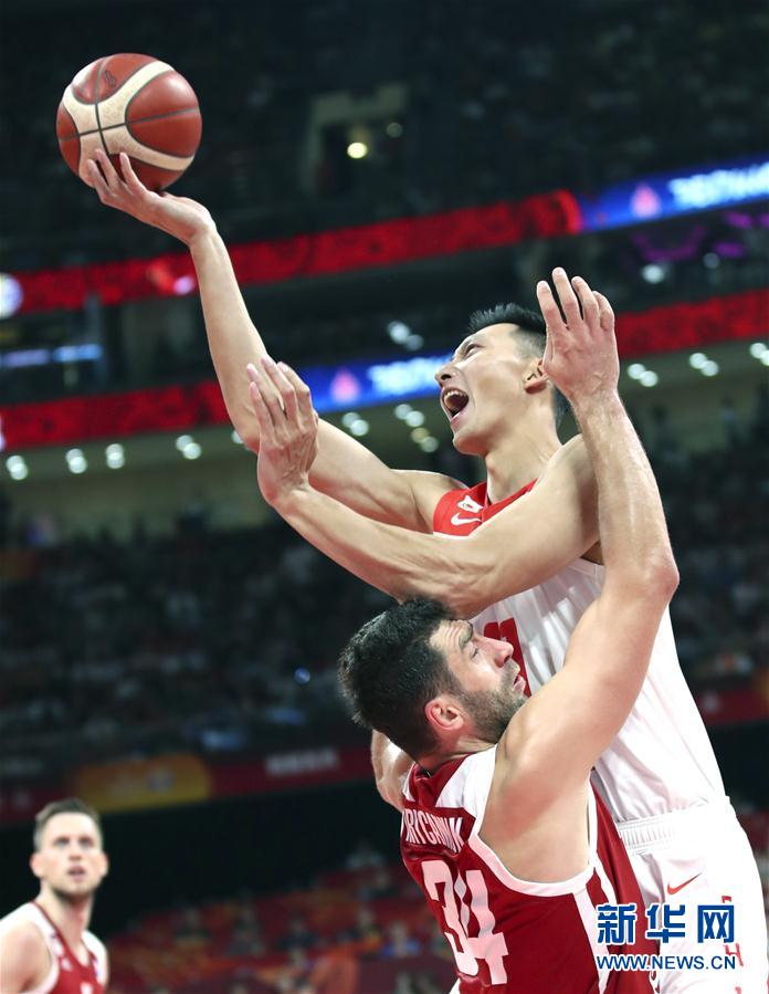 9月2日,中国队球员易建联(右)在比赛中上篮。 当日,在北京举行的2019年国际篮联篮球世界杯小组赛A组比赛中,中国队和波兰队在常规时间战平,通过加时赛,最终中国队以76比79不敌波兰队。 新华社记者孟永民摄