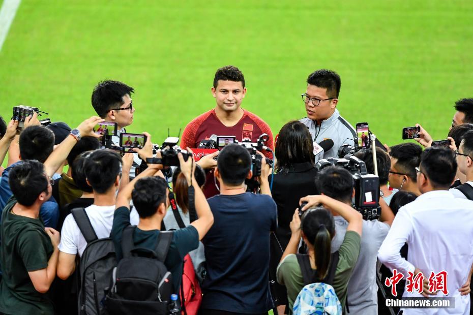 9月2日,广州天河体育中心,中国国家男子足球队球员艾克森(红衣)接受媒体采访。当日,为备战2022年卡塔尔世界杯预选赛亚洲区40强赛的比赛,中国国家男子足球队在广州进行集训。中新社记者 陈骥旻 摄