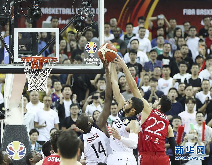 9月3日,土耳其队球员科尔克马兹(右一)与美国队球员塔图姆(右二)、米德尔顿(右三)在比赛中争抢篮板。 当日,在上海举行的2019年国际篮联篮球世界杯小组赛E组比赛中,美国队经过加时赛以93比92战胜土耳其队。 新华社记者丁汀摄