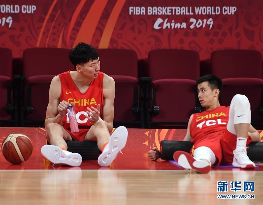 9月3日,中国队球员周琦(左)在训练中与队友赵继伟交流。 当日,中国队在五棵松体育馆进行训练,备战2019年国际篮联篮球世界杯小组赛第三场同委内瑞拉队的比赛。 新华社记者张晨霖摄