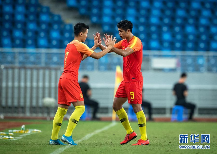 9月5日,中国队球员林良铭(左)替下队友张玉宁。 当日,在黄石奥体中心举行的2019中国足协中国之队黄石国际足球赛U22比赛中,中国U22国家队以1比1战平朝鲜U22国家队。 新华社记者肖艺九摄