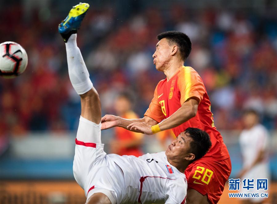 9月5日,朝鲜队球员钟约克(左)在比赛中倒钩射门。 当日,在黄石奥体中心举行的2019中国足协中国之队黄石国际足球赛U22比赛中,中国U22国家队以1比1战平朝鲜U22国家队。 新华社记者肖艺九摄