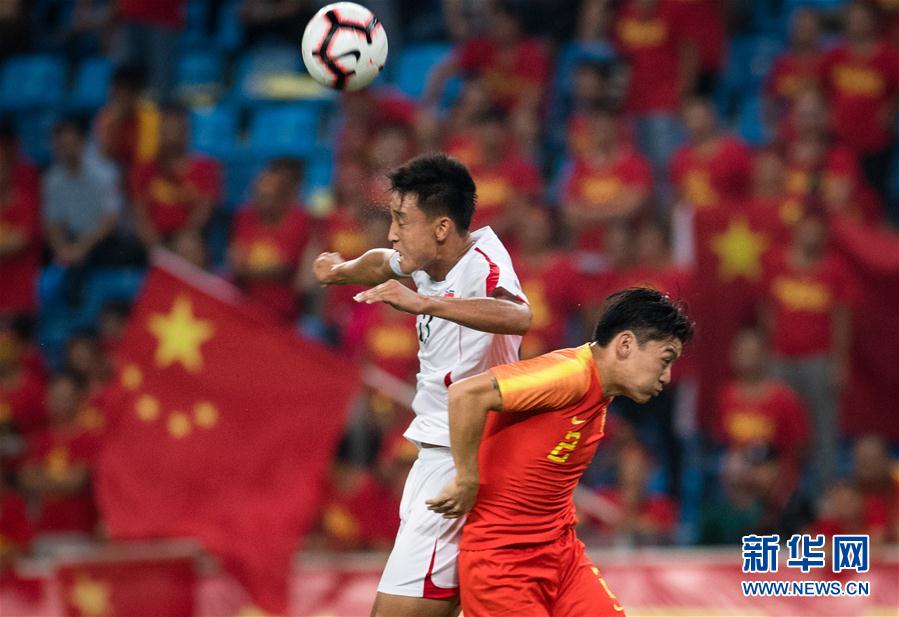 9月5日,中国队球员童磊(右)与朝鲜队球员席朱爱争顶。 当日,在黄石奥体中心举行的2019中国足协中国之队黄石国际足球赛U22比赛中,中国U22国家队以1比1战平朝鲜U22国家队。 新华社记者肖艺九摄