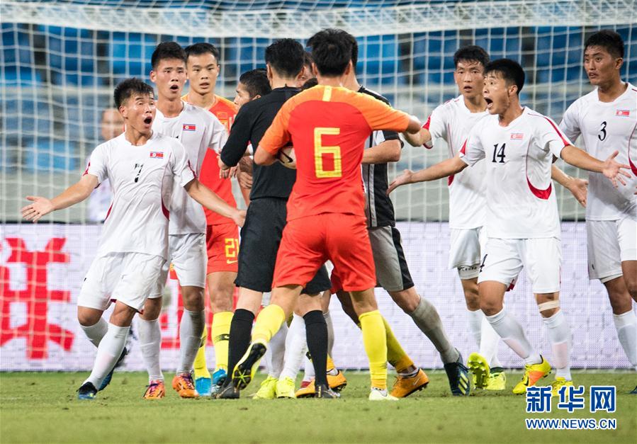 9月5日,朝鲜队球员在比赛中质疑裁判的点球判罚。 当日,在黄石奥体中心举行的2019中国足协中国之队黄石国际足球赛U22比赛中,中国U22国家队以1比1战平朝鲜U22国家队。 新华社记者肖艺九摄