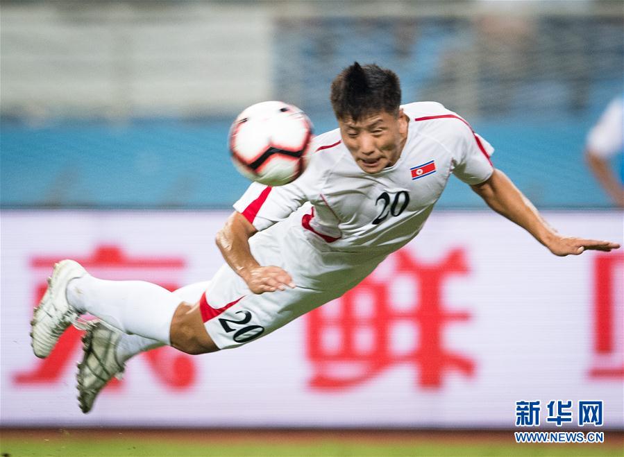 9月5日,朝鲜队球员李朱永在比赛中头球攻门。 当日,在黄石奥体中心举行的2019中国足协中国之队黄石国际足球赛U22比赛中,中国U22国家队以1比1战平朝鲜U22国家队。 新华社记者肖艺九摄