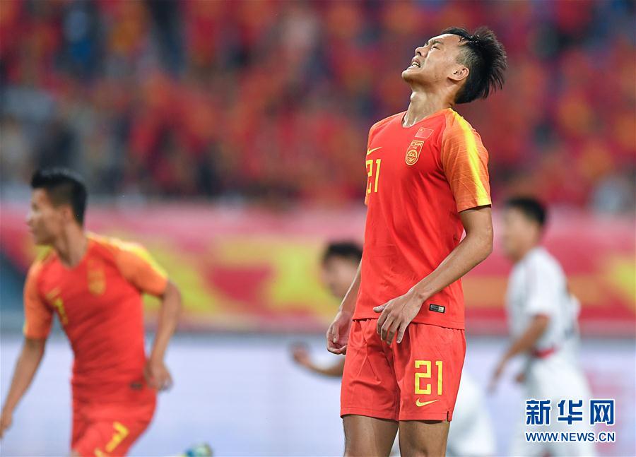 9月5日,中国队球员刘若钒(右)射失点球后神情懊恼。 当日,在黄石奥体中心举行的2019中国足协中国之队黄石国际足球赛U22比赛中,中国U22国家队以1比1战平朝鲜U22国家队。 新华社记者熊琦摄